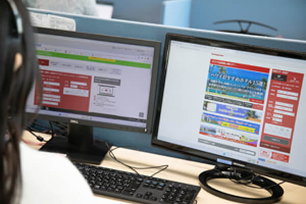 私が所属するコンタクトセンター部 海外予約グループは、海外ツアーの申込・問合せを電話とインターネットで受け付けており、電話やメール対応を主に行っています。お客さまからお問い合わせいただく内容は、商品の紹介やWEB操作方法の説明、現地情報の案内、予約の変更・取消に関するご相談など、多種多様です。お客さまのご希望に沿った商品を迅速にご提案できるよう、発売情報のチェックは欠かさずに行っています。