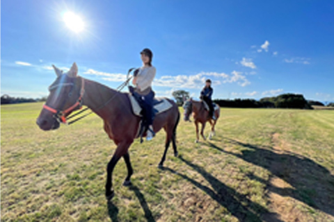 2023年10月、友人と那須の牧場で初めて乗馬に挑戦しました。広大な牧場をゆっくりと回ることができ、癒されました。後方が私。