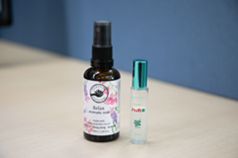 パソコン作業が続くと頭痛や肩こりの原因となるので、薬に頼る前に、ハッカオイルをこめかみに塗っています。また、仕事で疲れたときにリフレッシュスプレーをひと吹きすると、香りが漂いリラックスします。