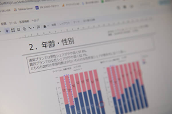 また自社商品を購入したお客さまの年齢・性別などの属性データを把握し、どのような流入経路で自社サイトに来訪しているのかを分析して、企画造成部門やWebサイトの制作担当者とその分析結果を連携し、さらなる集客に向けた提案を行っています。